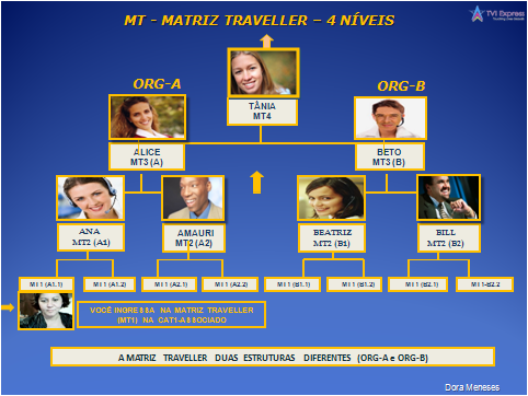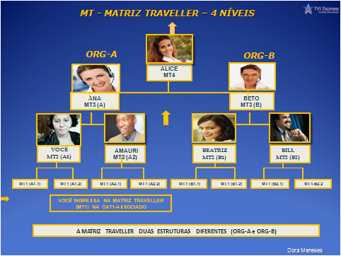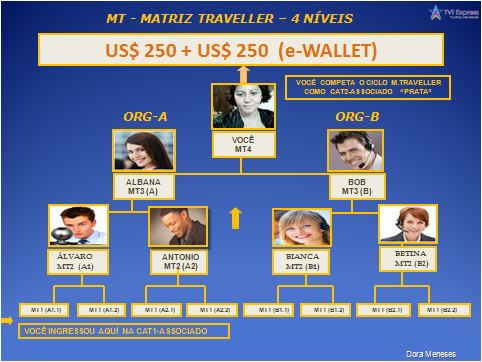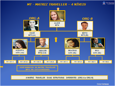 Você ingressa na TVI Express, nível 1 da Matriz Traveller, na categoria CAT1 “Associado”. Existem 4 níveis na Matriz Traveller. Os novos membros ingressam no MT1 e completam o ciclo quando chegam ao MT4, mediante o esforço conjunto de toda a equipe. Uma vez completado o ciclo da Matriz Traveller (MT1 a MT4), o associado sobe para a próxima matriz.